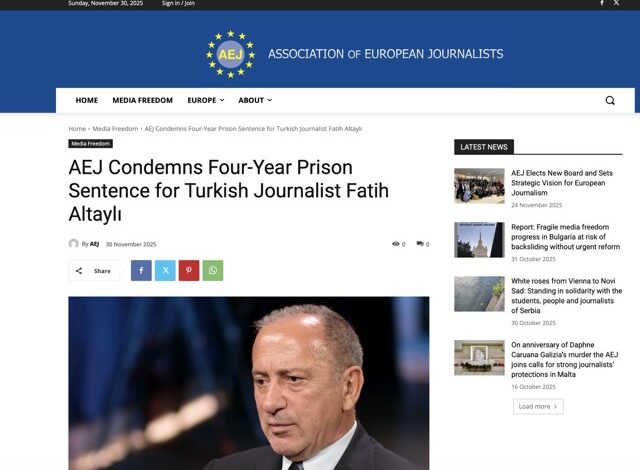 Mehr lesen »Brüksel, 27 Kasım 2025 – Avrupa Gazeteciler Derneği (AEJ), Türk gazeteci Fatih Altaylı’ya verilen dört yıl iki ay hapis cezasını…