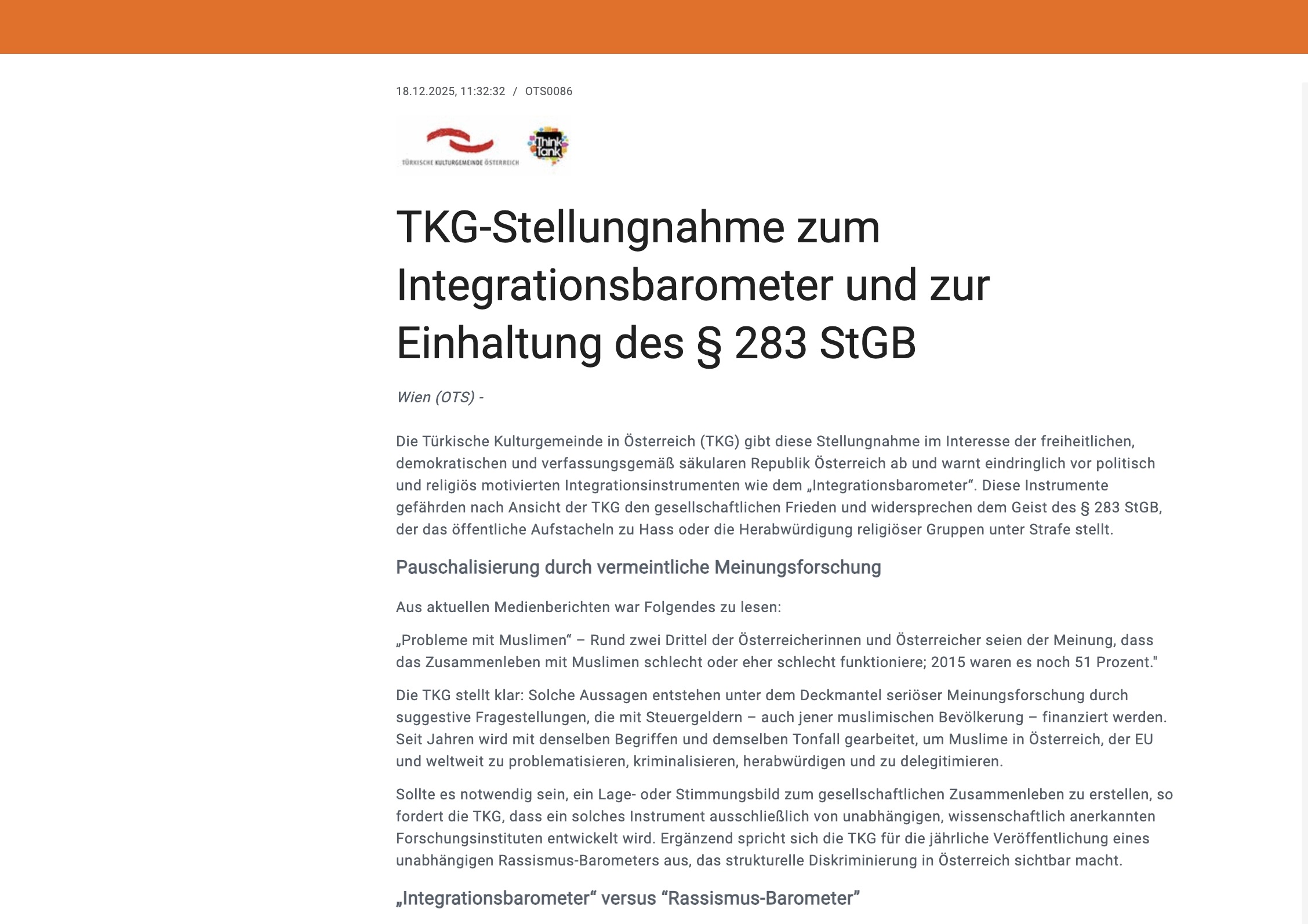 TKG, ÖVP’nin kontrolündeki Integrationsfonds tarafından, herkesin ödediği vergilerle finanse edilen ve kendilerine yakın dış anket şirketleri aracılığıyla yürütülen sözde “bilimsel araştırmanın” yöntemini eleştirdi. Müslümanlar hakkında çanak, telkin edici ve yönlendirici sorularla dolu; yalnızca 1000 kişiyle, alelacele telefon üzerinden yapılan bu çalışmanın bilimsel bir araştırma olarak sunulmasının toplumsal barışı tehdit ettiğini belirtmişti.