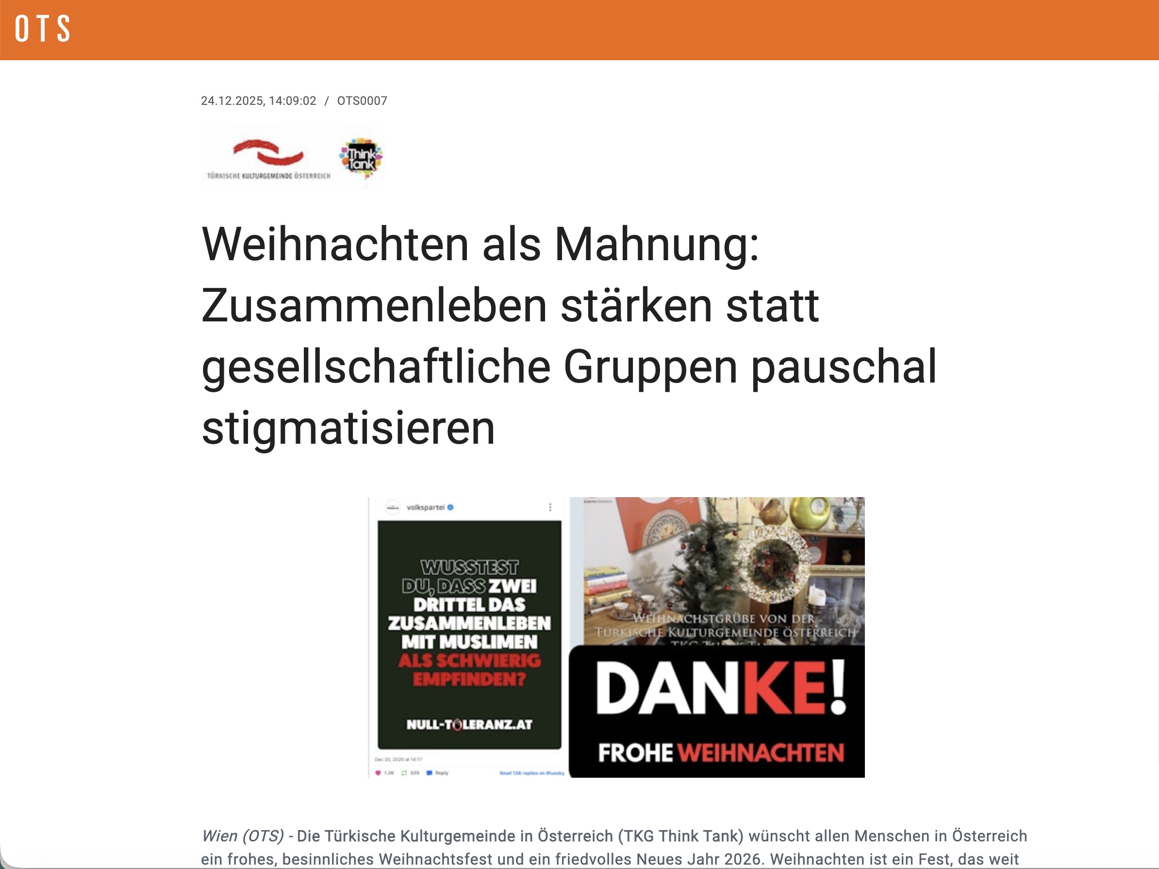 Avusturya Türk Kültür Cemiyeti (TKG), bu mesajı Noel’in birleştirici ruhuna uygun olarak 24 Aralık 2025 tarihinde yayımladığı bir APA-OTS basın bildirisi ve kendi resmi sayfaları üzerinden kamuoyunun dikkatine sundu.