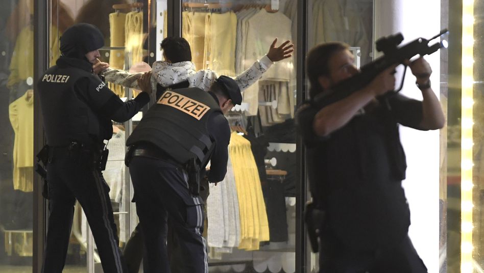 02.11.2020, Österreich, Wien: Schwerbewaffnete Polizisten kontrollieren in der Wiener Innenstadt eine Person. Ein Beamter hat sein Gewehr im Anschlag. Bei den Schüssen in Wien handelt es sich nach den Worten von Österreichs Innenminister augenscheinlich um einen Terroranschlag. Foto: Roland Schlager/APA/