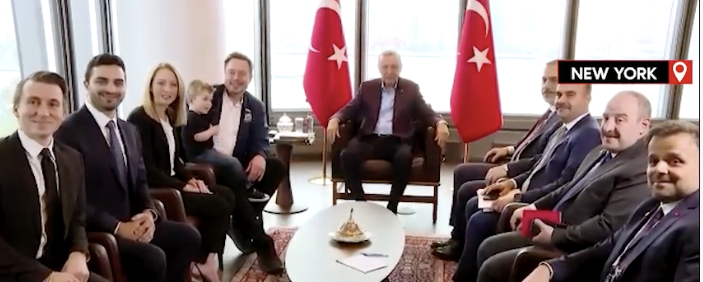 Dünyanın en büyük servetine sahip ve en büyük uzay ve teknoloji şirketi TESLA’nın sahibi olan Elon Musk, Cumhurbaşkanı Recep Tayyip Erdoğan ile görüşmek üzere New York’ta bulunan Türkevi’ne geldi ve 45 dakika görüştü.  Erdoğan, Twitter’ın (X ) sahibi olan Musk’a „Daha Adil Bir Dünya Mümkün“ adlı kendi fotoğrafının olduğu kitabını koltuk altı yaptıracak şekilde hediye etmiş. Hayırlı olsun.