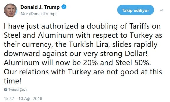 Twitter üzerinden açıklama yapan Trump, „Türk Lirası’nın ABD Doları karşısında hızlı şekilde geri gelmesine bağlı olarak çelik ve alüminyum tarifelerinin ikiye katlanmasına onay verdim. Alüminyumda tarife şimdi yüzde 20, çelikte yüzde 50 olacak. Türkiye ile ilişkilerimiz şu anda iyi değil“ ifadelerini kullandı.