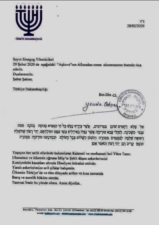 İstanbul. Türk Yahudi Toplumu, şabat tefilasında tüm sinagoglarda şehit askerler ve yaralılar ile memleketin huzuru, bekası ve esenliği için dua etti.