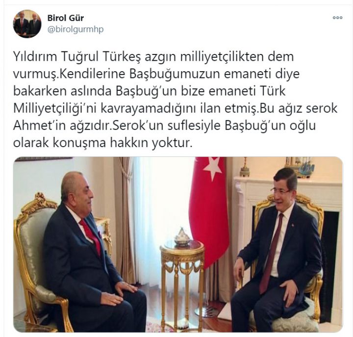 MHP İstanbul İl Başkanı Birol Gür, Tuğrul Türkeş’e “Yıldırım Tuğrul Türkeş azgın milliyetçilikten dem vurmuş. Kendilerine Başbuğumuzun emaneti diye bakarken aslında Başbuğ’un bize emaneti Türk Milliyetçiliği’ni kavrayamadığını ilan etmiş.Bu ağız serok Ahmet’in ağzıdır.Serok’un suflesiyle Başbuğ’un oğlu olarak konuşma hakkın yoktur” sözleriyle yüklendi.