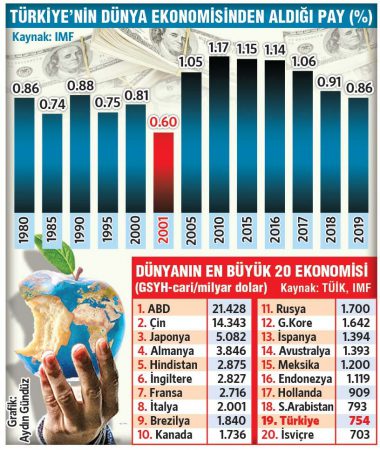 Milli geliri ile dünyanın 17’nci büyük ekonomisi unvanını 2018’de kaybeden ve 2 yıldır 19’uncu sıraya yerleşen Türkiye’nin küresel ekonomideki payı da tekrar yüzde 1’in altına geriledi. Türkiye’nin en ağır krizini yaşandığı ve ekonominin yüzde 9.5 daraldığı 2001 yılında küresel ekonomiden aldığı pay yüzde 0.60 ile 1980-2019 yılları arasındaki en dip seviyesini görmüştü.