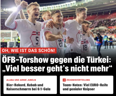 Krone ise şunu yazdı : „Avusturya milli marşı „Land der Berge, Land der Äcker“ („Dağlar ülkesi, tarlalar ülkesi“) bundan sonra „Land der Blitztore“ („Yıldırım golleri ülkesi“) ile genişletildi. En azından gönüllerde. Avusturya’nın milli marşı aslında yakında yeniden yazılmalı. Çünkü Christoph Baumgartner’in geçen Cumartesi Bratislava’da Slovakya’ya 6.3 saniye sonra attığı dünya rekoru golünü dün Türkiye’ye karşı kırmızı-beyaz-kırmızıdan gelen bir sonraki „yıldırım“ izledi – kelimenin tam anlamıyla bile, çünkü 103 saniye sonra golü atan Xaver Schlager’di.“ Türkiye karşısında 6:1’lik gol şov – takım patronu Ralf Rangnick ÖFB takımının ikinci 45 dakikadaki performansından çok memnun: „Mola sonrasından daha iyisi olamaz!“ Avusturyalı taraftarlar şimdiden EURO için sabırsızlanıyor: „Oh, ne kadar güzel!“