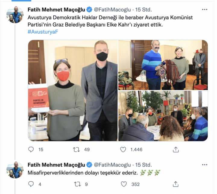 „Avusturya Demokratik Haklar Federasyonu’nun düzenlediği bir etkinlik için Avusturya’ya giden Tunceli Belediye Başkanı Fatih Mehmet Maçoğlu ve Sosyalist Meclisler Federasyonu (SMF) heyeti Avusturya Komünist Partili Graz Belediyesi’ne bir ziyaret gerçekleştirdi. Heyeti, Graz Belediye binası girişinde Belediye Başkanı Elke Kahr, belediye meclis üyeleri Robert Krotzer ve Max Zirngast karşıladı. Sıcak karşılamanın ardından belediye başkanının makam odasında bir sohbet gerçekleşti. Burada kentlerle ilgili bilgilendirmeler yapıldı ve her iki belediye başkanı karşılıklı olarak belediye faaliyetleri hakkında bilgi verdi. Görüşmede karşılıklı olarak politik gidişat ve sol sosyalist ve komünist partilerin kazandıkları başarılar değerlendirildi. Fatih Mehmet Maçoğlu’da görüşmede Tunceli Belediyesi’nin çalışmalarından bahsederek Graz Belediye Başkanı Elke Kahr’ı Tunceli şehrine davet etti. Daha sonra Belediye binasından ayrılan heyet Graz Komünist Partisi parti binasında yapılacak heyetler arası görüşmeye geçerek görüş alışverişinde bulundular.“