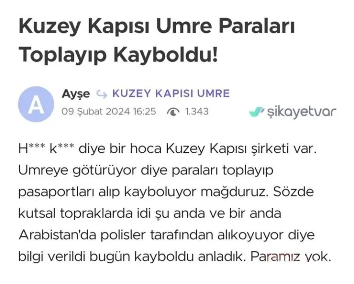Sabah gazetesinden Huzeyfe Atıcı’nın haberine göre, rezervasyon yaptıran kişiler, kendilerinden talep edilen ücretleri Hüseyin K’ye gönderdiler ve gidecekleri günü beklemeye başladılar. Planlanan gün geldiğinde ise Hüseyin K. vatandaşları umreye götürmedi. Devam eden süreçte acentenin kendilerini oyaladığı fark eden mağdurlar, dolandırıldıklarını belirterek adliyeye gitti. Şikayet üzerine Hüseyin K. hakkında soruşturma başlatıldı.