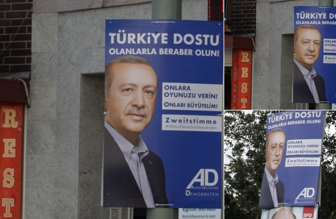 „Der Aufruf von Staatspräsident Erdogan schlägt in Deutschland hohe Wellen. Die von den Migranten gegründete Partei Allianz deutscher Demokraten (ADD) wirbt für die Bundestagswahl am 24. September mit Erdogan-Plakaten, worauf die Worte von Erdogan zu sehen sind. Der Staatspräsident hatte bei seiner an die in Deutschland lebenden Türken adressierten Rede folgendes gesagt: „Gibt eure Stimmen nicht an die Parteien, die der Türkei feindlich gesinnt sind. Seid mit den Türkeifreunden zusammen. Schaut nicht darauf, ob es sich dabei um kleine Parteien handelt. Gebt eure Stimmen an diese Parteien, damit die grösser werden.“ Diesen Appell von Erdogan nutzte die ADD bei den Wahlplakaten. Zudem bereitete sie ein Video mit der Übersetzung der Rede von Erdogan vor. Auf den Wahlplakaten von ADD ist neben ein Foto von Erdogan auch die Worte des Staatspräsidenten, „Seid mit den Türkeifreunden zusammen. Gebt eure Stimmen an sie“ zu sehen. Die Plakate bringt die ADD in deutschen Städten mit großem Bevölkerungsanteil an Türken an. Unterdessen hatte eine andere von Migranten gegründete Partei, die BIG sich entschieden, nicht an den Bundestagswahlen teilzunehmen.“