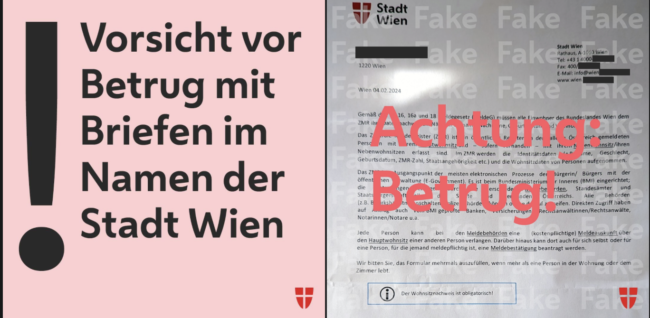 Viyana Belediyesi´nin sosyal medya üzerinden yaptığı uyarı şöyle : “ Şu sıralar Viyana’daki hanelere posta yoluyla, şehir departmanlarından veya yetkililerinden geldiği iddia edilen dolandırıcılık mektupları gönderiliyor. Mektuplarda hassas ve kişisel kayıt verilerinin bir internet formuna girilmesi isteniyor.