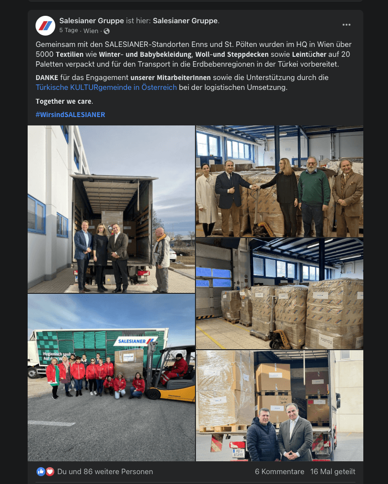 „Günlerdir bu bağışların düzgün bir şekilde hazırlanması için bizimle irtibatta olan ve kalbi Türkiye’deki tüm depremzede insanlar için atan, 1916’da Viyana’da kurulmuş, 9 ülkede aynı isim ve 3500 çalışanı ile başta otel, hastane olmak üzere tüm yüksek kurumlara hizmet ederek haftada 550 ton temizlik, çamaşır ve tekstil ihtiyaçlarını karşılayan insana hizmet odaklı Firma Salesianer şirketinin değerli CEO’su ve çok kıymetli asistan sayın hanımefendiye ve tüm çalışanlarına, içtenlikle teşekkür ederiz. Bağışlarını teslim ettik. Mutluyuz. Umarız bağışlar depremzedelere en kısa sürede direk ve sade bir şekilde teslim edilir. Buna eminiz…“