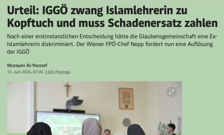 Viyana'da İş ve Sosyal Mahkemesi'nin ilk kararına göre, kısa adı IGGÖ olan "Islamische Glaubensgemeinschaft" adlı Avusturya İslam Toplumu eski bir İslam öğretmenine " baş örtüsü takmaya zorladığı için ayrımcılık yapmıştır. IGGÖ 15.000 dolar ödemek zorunda kararı verdi. IGGÖ ancak karara karşı temyize gitmeyi planlıyor. Viyanalı FPÖ lideri Nepp şimdi IGGÖ'nün feshedilmesi çağrısında bulunması dikkat çekti.