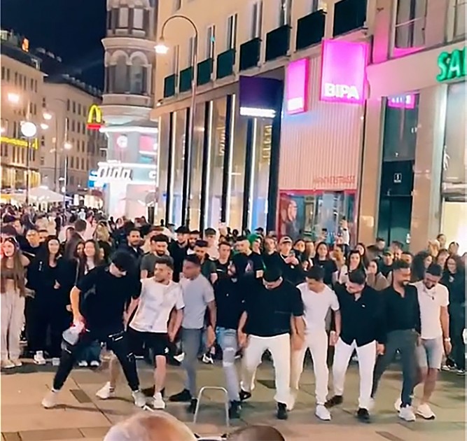 Göç geçmişine sahip yüzlerce erkek, cumartesi akşamı Kärntnerstraße’nin yaya bölgesini işgal etti ve engelledi. Kalabalık grup, gece boyunca yüksek sesle Arapça şarkılar söyleyip halay çekerek eğlendi. Suriyeli grubun eğlenceli görüntüleri TikTok’ta viral olunca, kötü yorum ve eleştirilerin hedefi oldu. Videolardan biri yaklaşık 360.000’den fazla kez izlendi.