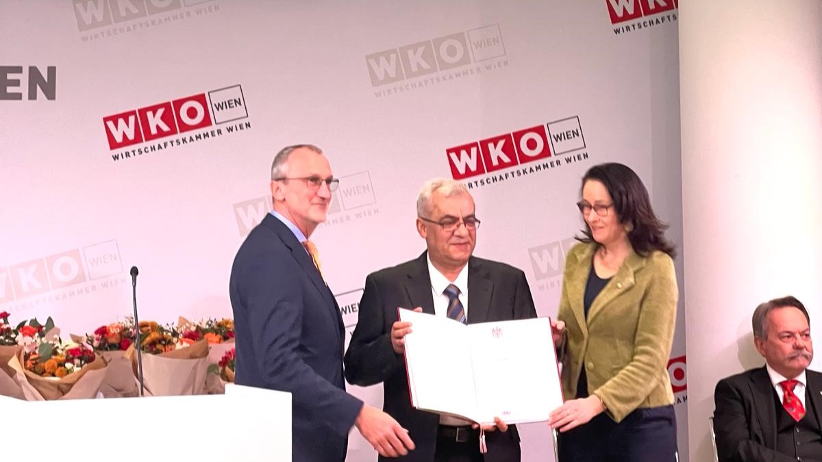 Viyana Ticaret Odası Müdürü Meinhard Eckl, Ali Çelik’e Kommerzialrat ünvanı belgesini takdim ederken, Çelik’in Türkiye’de İnşaat Mühendisliği eğitiminin ardından sürdürdüğü başarılı yöneticiliğini ve Viyana’ya geldikten sonra iş dünyasında son 35 yılda elde ettiği başarılarını anlattı.