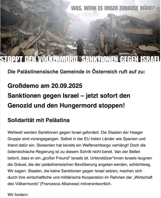 Avusturya Filistin Toplumu (Palästinensische Gemeinde in Österreich), 20 Eylül 2025 Cumartesi günü Viyana’da düzenlenecek büyük mitinge çağrıda bulundu. Duyuruda, Gazze’deki saldırıların ve açlık yoluyla ölümlerin durdurulması için İsrail’e karşı uluslararası yaptırım talep edildi. Etkinlik “Filistin ile Dayanışma” başlığıyla duyuruldu.