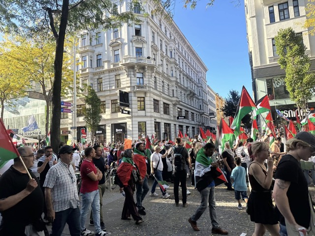 Filistin Temsilcisi Shafi’den sert çıkış: “ABD’nin sırtını yasladığı bir haydut devlet". Gazze’deki saldırılara karşı uluslararası yaptırım çağrısı, “soykırım ekonomisine ortaklık” suçlaması. 20 Eylül 2025 Cumartesi günü Viyana’da düzenlenen Filistin dayanışma yürüyüşüne polis verilerine göre 3.000 ila 3.500 kişi katıldı. Gösteri, İsrail’in Gazze’deki askeri operasyonlarını “soykırım” olarak nitelendiren katılımcıların, İsrail’e karşı uluslararası yaptırımlar talep ettiği en büyük protestolardan biri oldu.