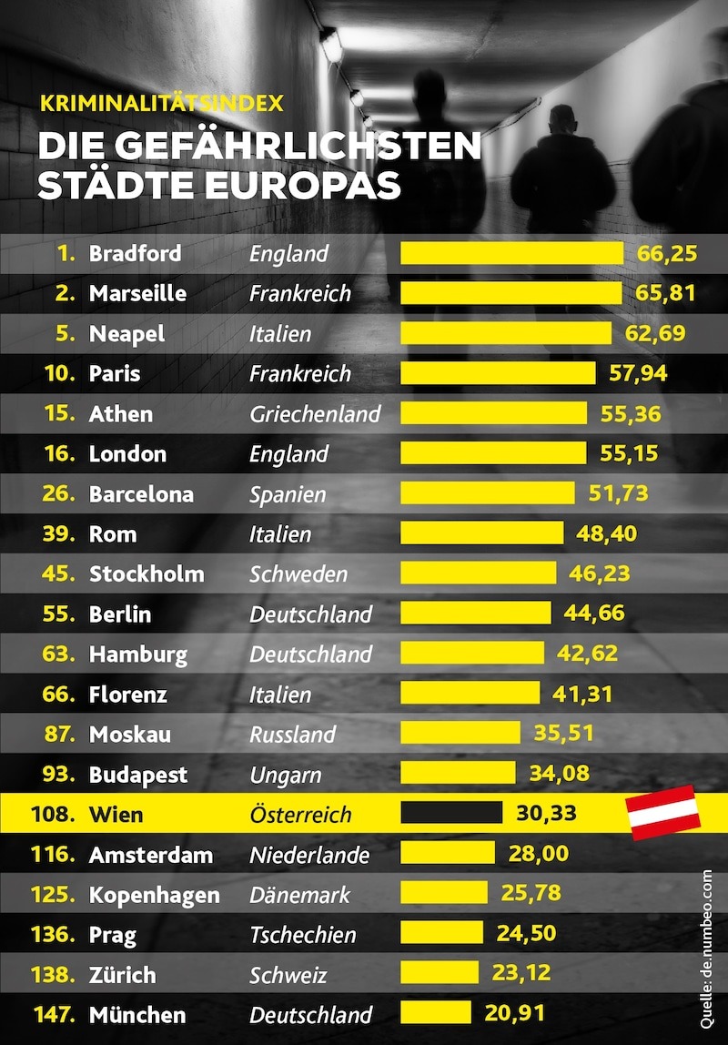 Tecavüz (468 rapor) de daha sık görülürken, soygun suçları – göç nedeniyle artan nüfusa rağmen – yüzde beş oranında azalmıştır. En sık suç işlenen yerler: sokaklar, otoparklar ve diğer kamusal alanlar. Biz kutsanmış bir ada değiliz, ama gerçekten tehlikeli olan farklı görünüyor. Bu, Viyana’nın (108. sıra, yukarıdaki grafik) oldukça iyi bir performans sergilediği 150 Avrupa şehri arasında yapılan bir karşılaştırma ile gösterilmektedir. Alman Numbeo platformunun suç endeksi, kent sakinlerinin kentlerinde suçun ne kadar ciddi olduğunu düşündüklerini yansıtıyor.