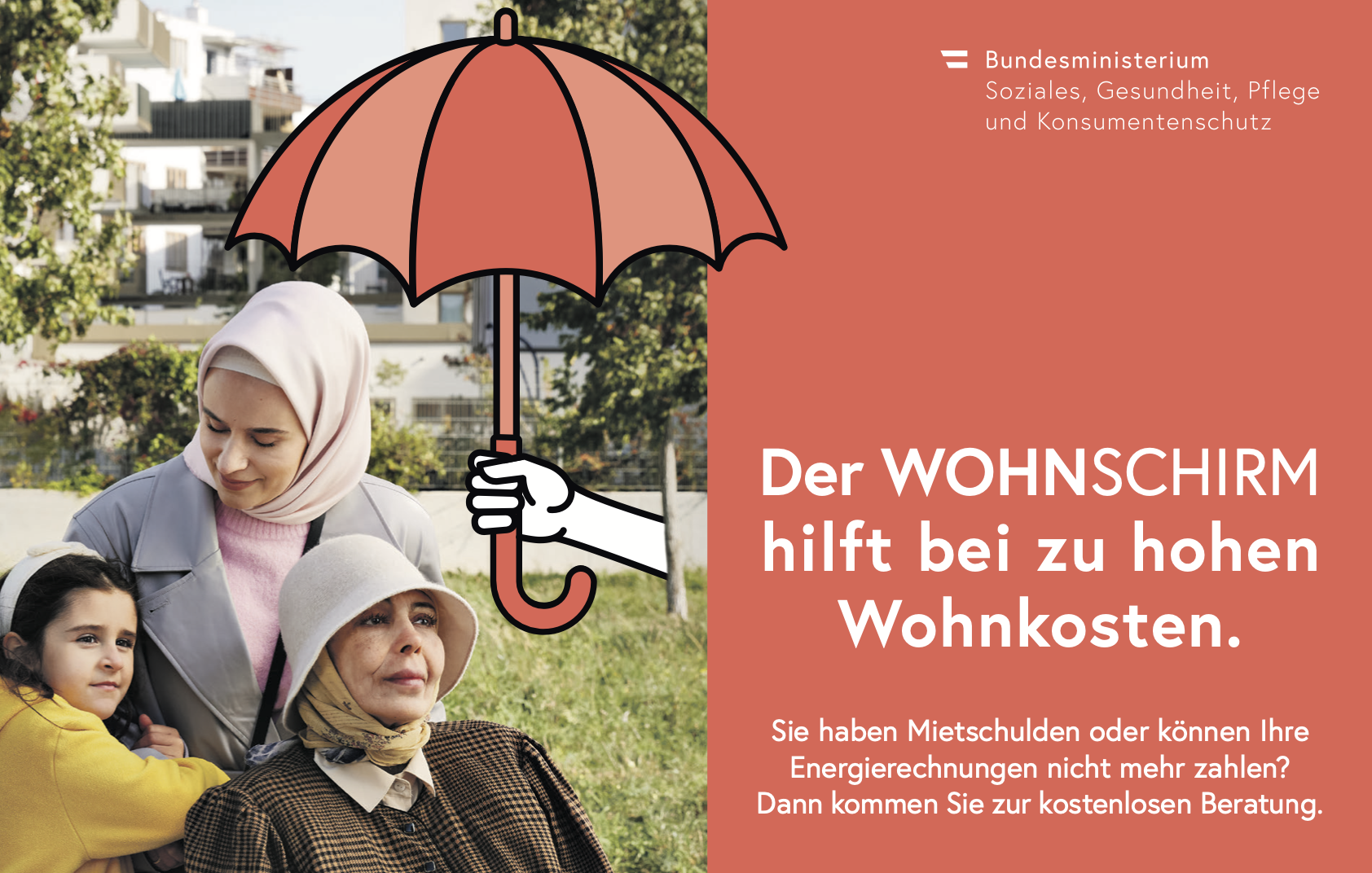 Avusturya Sosyal İşler Bakanlığı’nın WOHNSCHIRM(Konut şemsiyesi) programı, COVID-19 salgını veya mevcut enflasyon nedeniyle kiralarını artık ödeyemeyen ve bu nedenle evlerini kaybetme riski altında olan kiracıları korumak amacıyla başlatılmıştır.