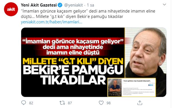 Ölümüyle gazetecilik camiasını derinden üzen Bekir Coşkun'un ardından Yeni Akit gazetesi skandal bir paylaşıma imza attı. Rasim Bolbol isimli köşe yazarı, "en nihayetinde bir imamın eline düştü. O, maşeri vidana hep kulak tıkadı. Elbette bu kulak tıkamalar, gassalın kendisine pamuğu tıkamasına engel olamadı" ifadelerini kullandı Kaynak: Yeni Akit gazetesinden Bekir Coşkun'un ardından iğrenç sözler