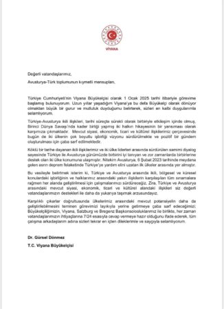 Türkiye'nin yeni Viyana Büyükelçisi Gürsel Dönmez, güven mektubunu Avusturya Cumhurbaşkanı Alexander Van der Bellen'e yakında sunarak resmen göreve başlamadan önce bir mesaj yayınladı.