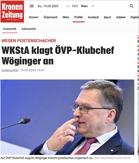 VİYANA. Krone Gazetesi’nin verdiği habere göre, ÖVP kulüp başkanı Wöginger, eski Maliye Bakanlığı kabine şefi ve hala yolsuzluk davaları devam eden, dünya basınına konu olan Thomas Schmid’e, Braunau, Ried ve Schärding vergi dairesinin yönetim kuruluna bir ÖVP belediye başkanının atanması için müdahale etmekle suçlanıyor. Onunla birlikte Maliye Bakanlığı’ndan iki memur da suçlanıyor.
