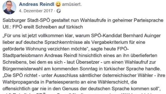 2017 yerel seçimlerinde kısa adı SPÖ olan Avusturya Sosyal Demokrat Partisi adayı Bernhard Auinger’in Türk topluma Türkçe seslenişi hakkında, SPÖ’nün seçim kampanyasının Almanca konuşmak istemeyen bir gruba yönelik olduğunu söyleyen Reindl, “SPÖ adayı Bernhard Auinger’in, sosyal konut hakkı için Almancanın neden bir kriter olmasını istemediği şimdi açıklık kazandı.” şeklinde bir mesaj yayınlamıştı.
