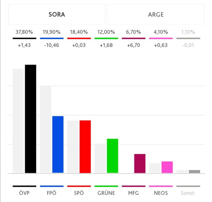 Yüzde 37,8 ile ÖVP önde (+1,43), FPÖ yüzde 19,9’a, SPÖ yüzde 18,4’e, Yeşiller yüzde 12’ye ulaşıyor. Yeni MFG listesinin yüzde 6,7 ile eyalet parlamentosuna girmesi bekleniyor. NEOS ise yüzde 4,1 ile en kötü sonucunu elde ediyor.